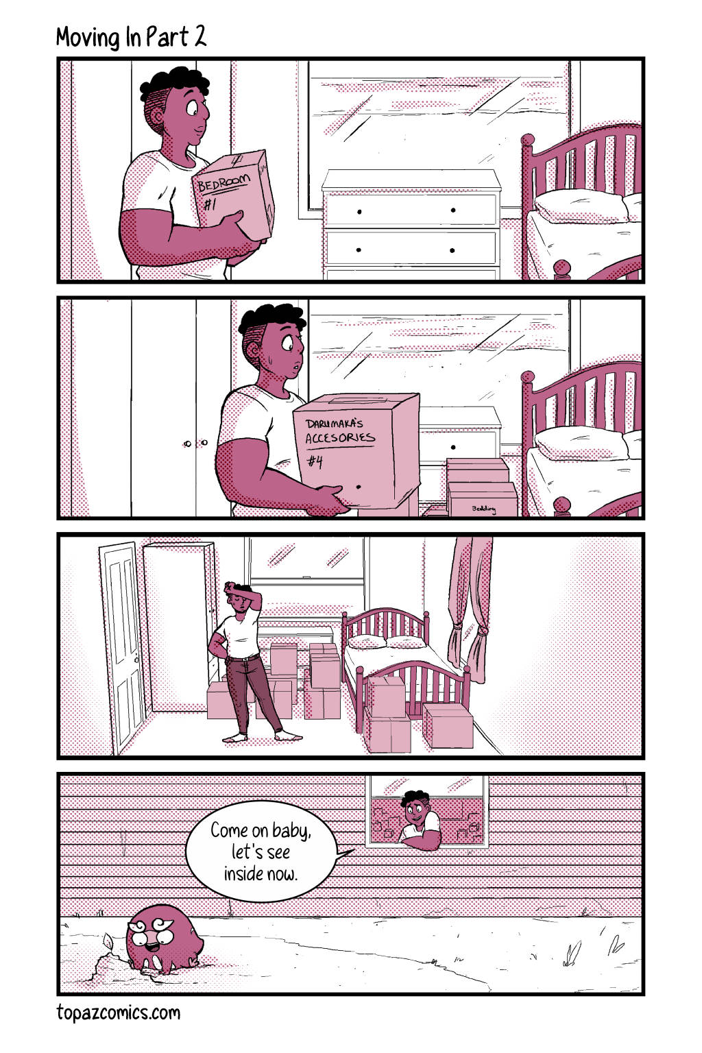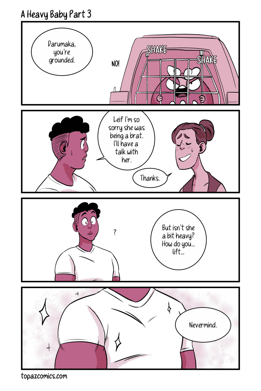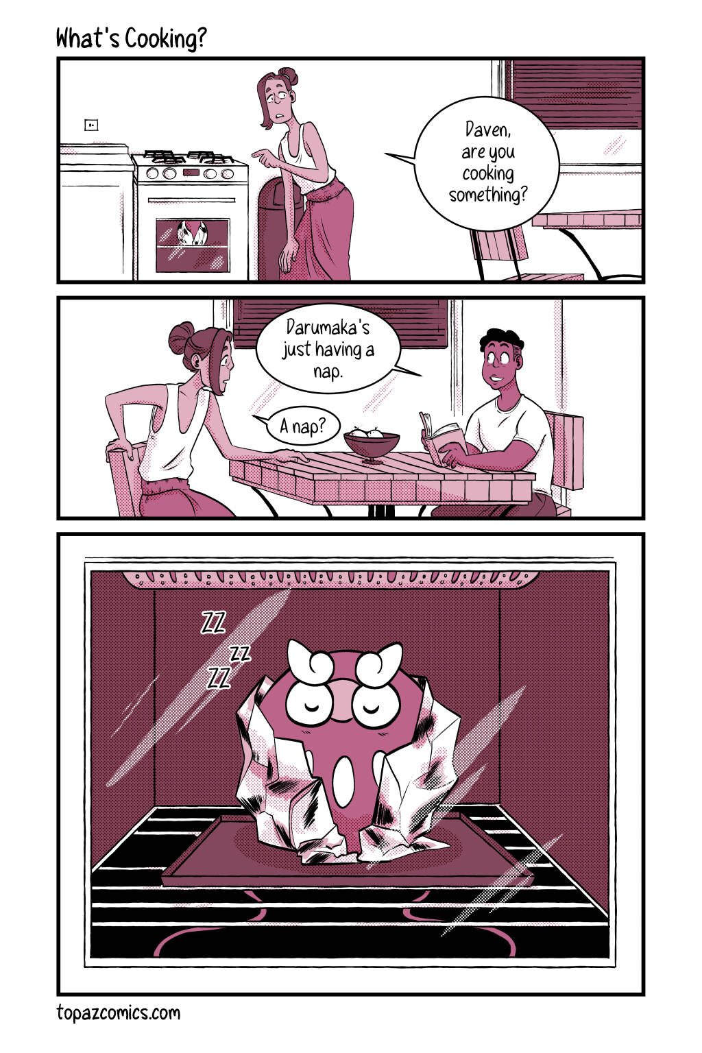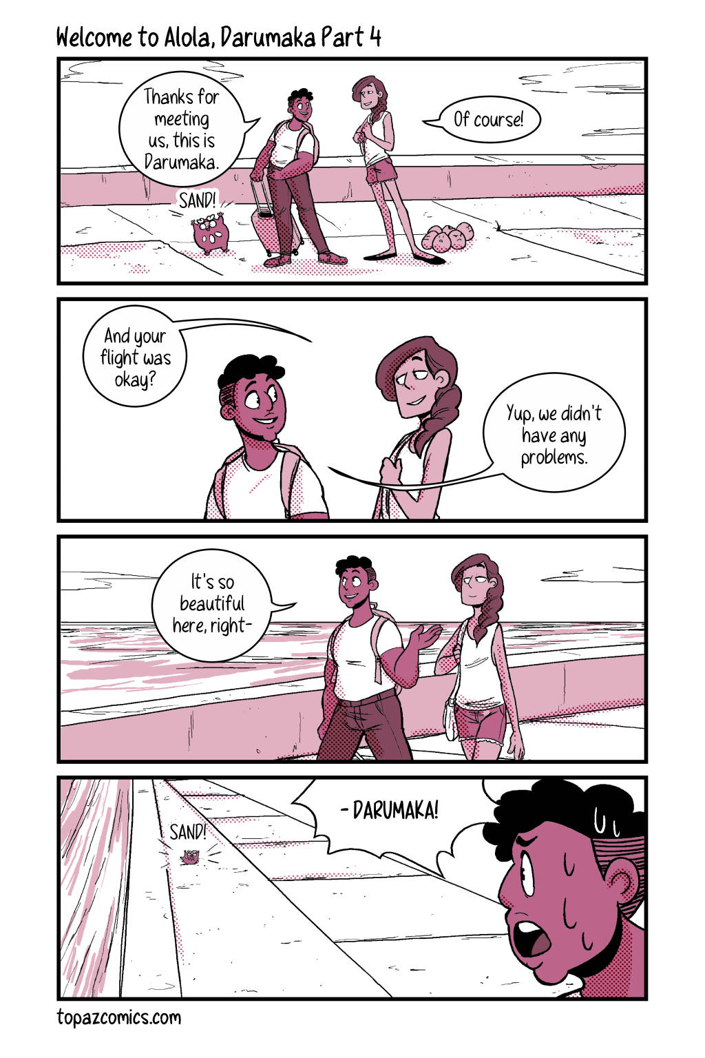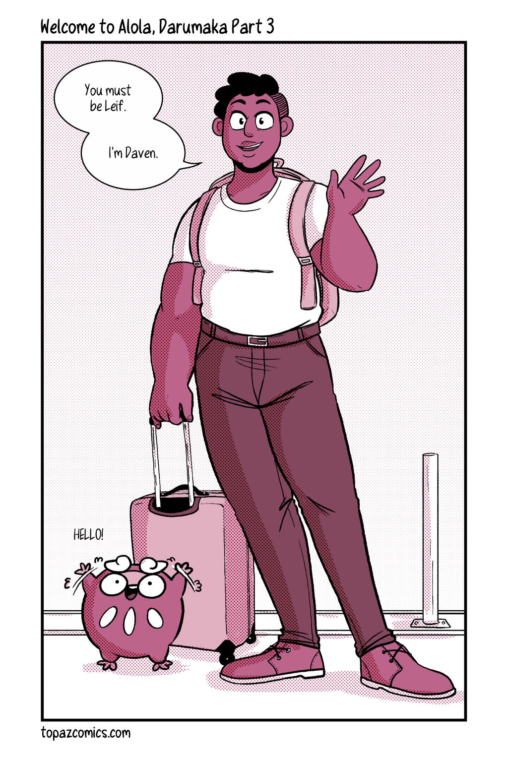 Your sneak peak page for this week and–Darumaka has finally arrived, along with her handsome partner Daven! Michelle and I are super excited to continue sharing this comic with you for this month, we hope you like what we have so far! Tune in next week for the last preview page!