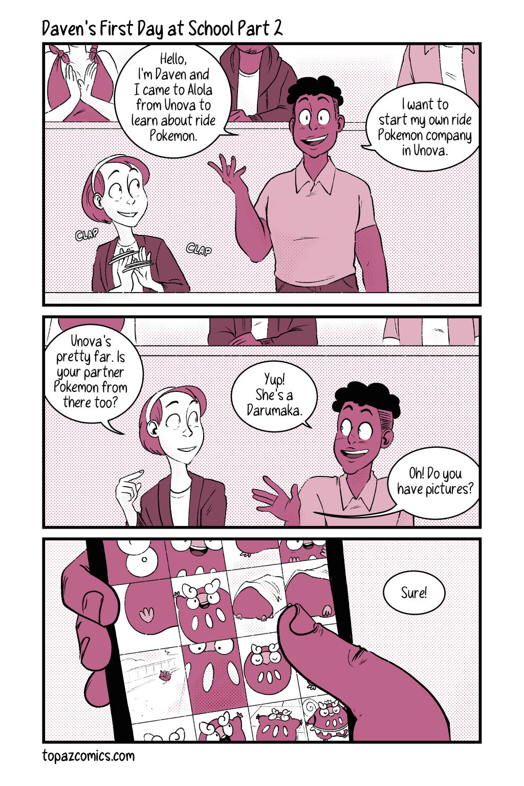 Daven and Darumaka have moved to Alola for school and Darumaka has to face a tough truth about college. Daven 100% reminded her about this for the last 6 months. For just $1/month you can see these pages 2 months before they’re posted here (including sketches and thumbnails) on Patreon!