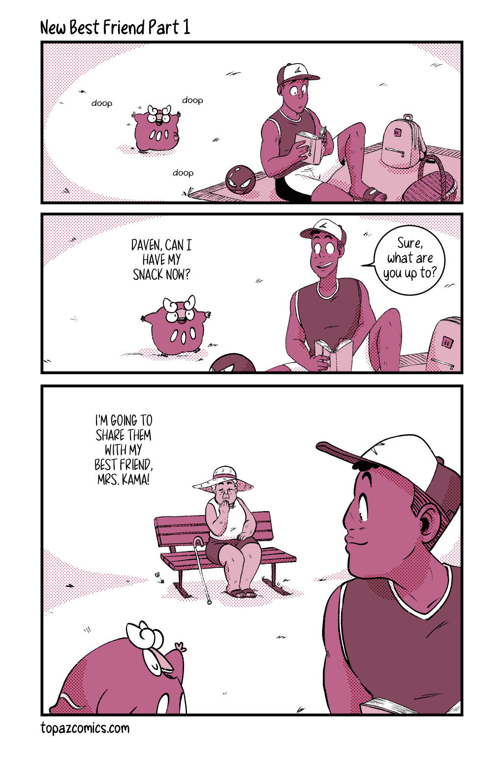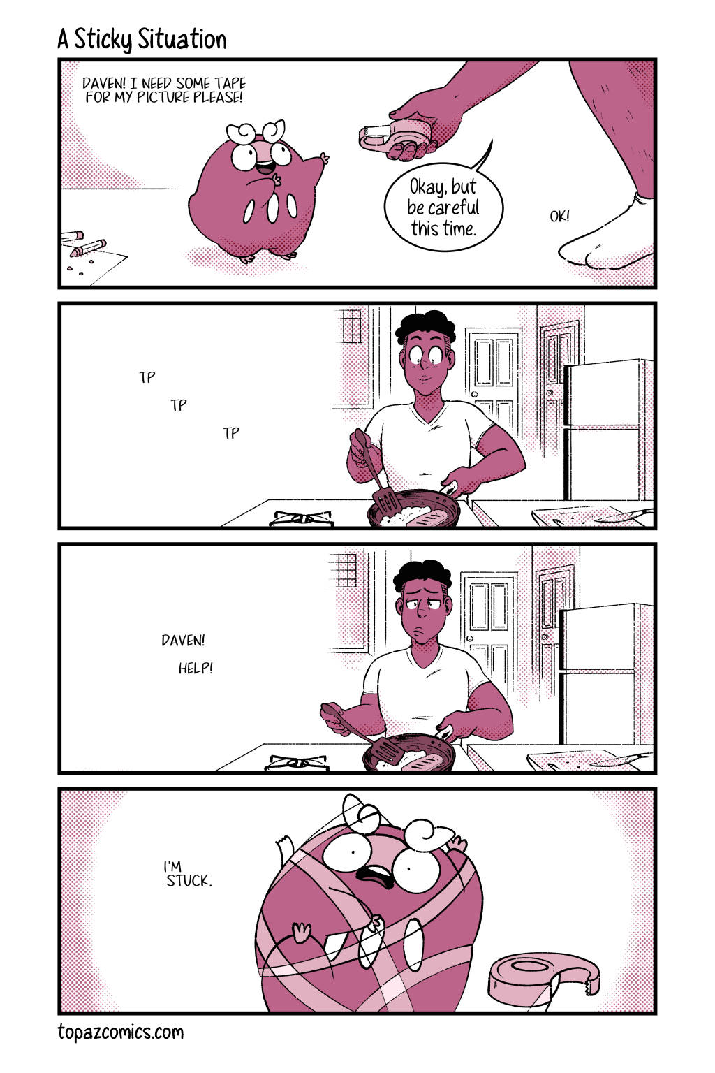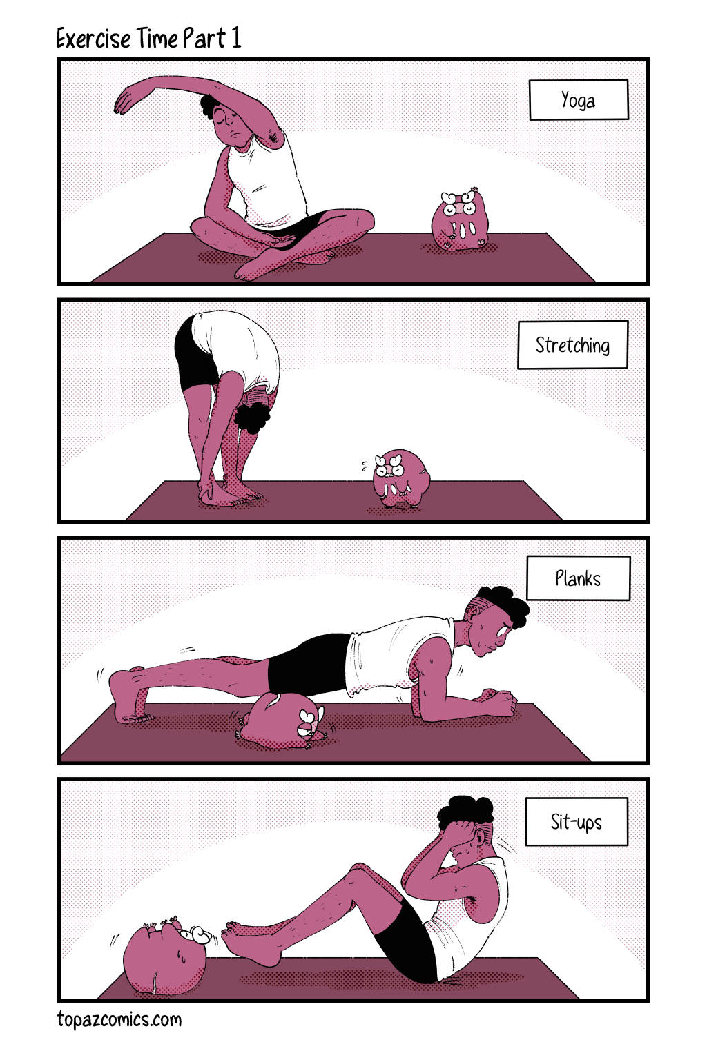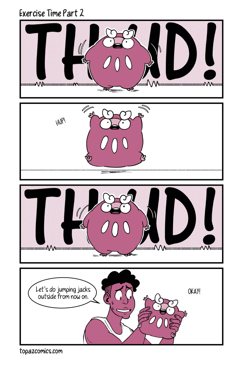 She’s very dense and shakes the little house they’re in when she tries to copy Daven’s exercise routine. For just $1/month you can see these pages 2 months before they’re posted here (including sketches and thumbnails) on Patreon!