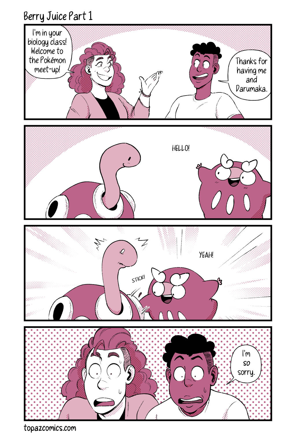 Part 1 of 2, Darumaka meets a new friend but there are things you shouldn’t do when introducing yourself. For just $1/month you can see these pages 2 months before they’re posted here (including sketches and thumbnails) on Patreon!