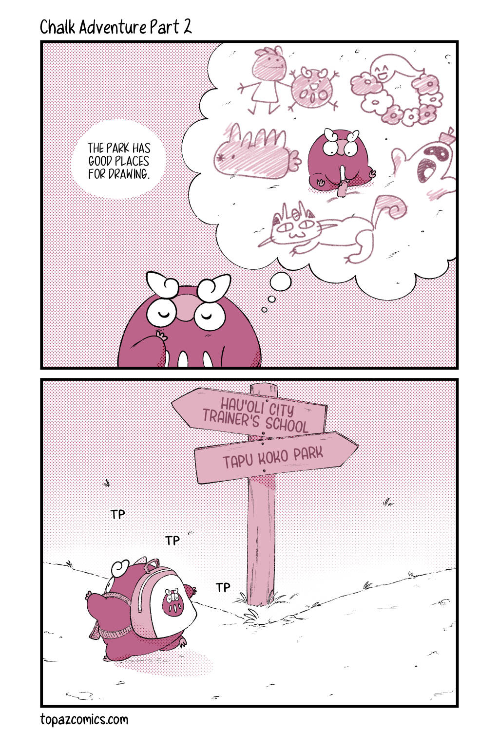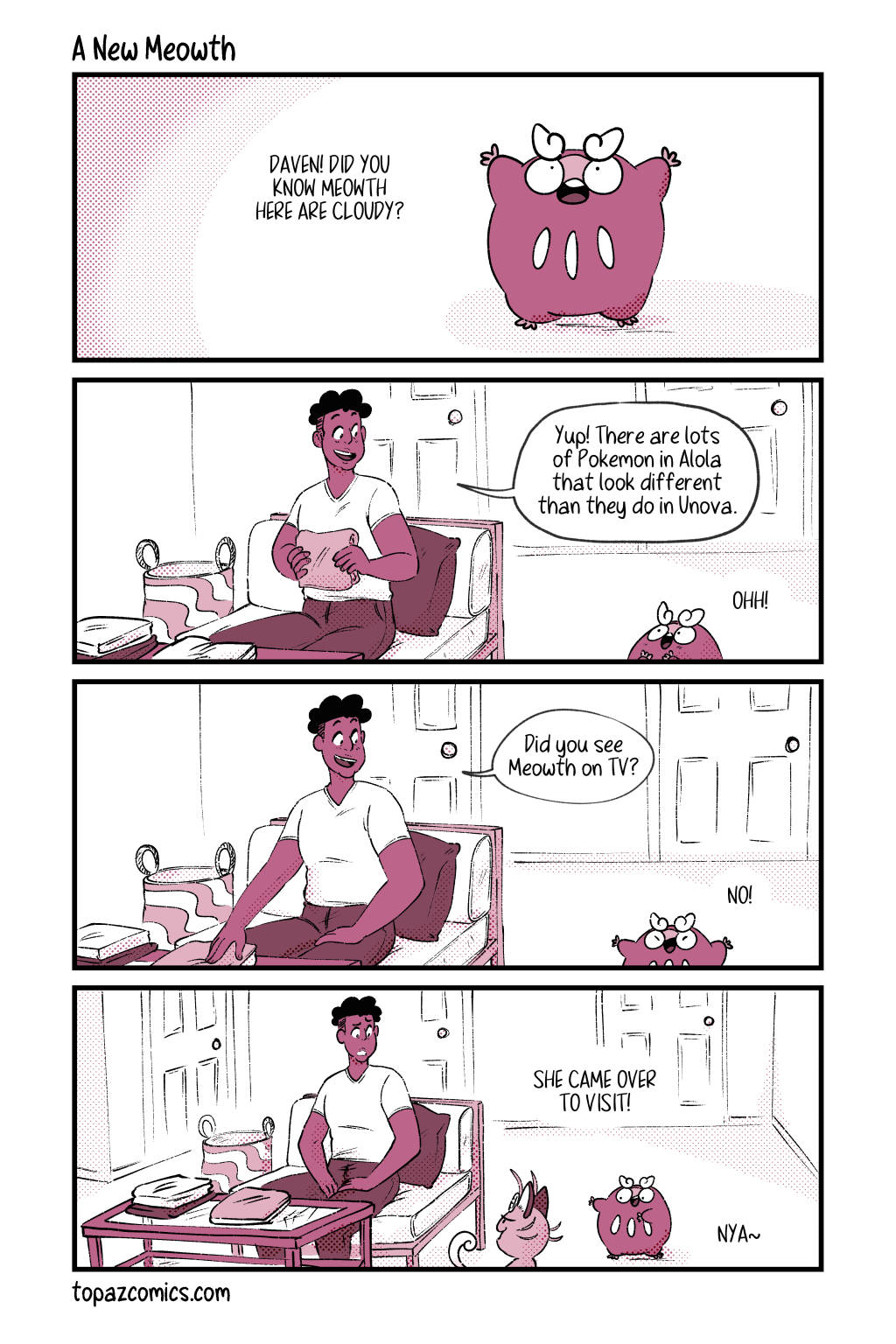 Maka meets Alolan Meowth, who just struts right into the house. Don’t worry about it. For just $1/month you can see these pages 2 months before they’re posted here (including sketches and thumbnails) on Patreon!