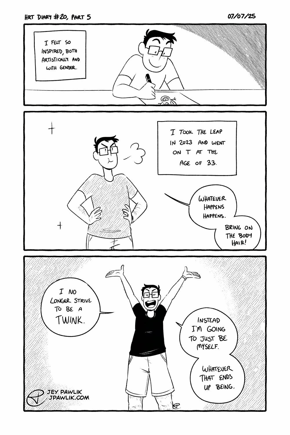 I was excited to come back to more HRT Diary comics so I have a 5 pager that’ll go up every Tuesday for the next few weeks on HRT and expectations. Something I’ve thought about for a while. It has a happy ending!