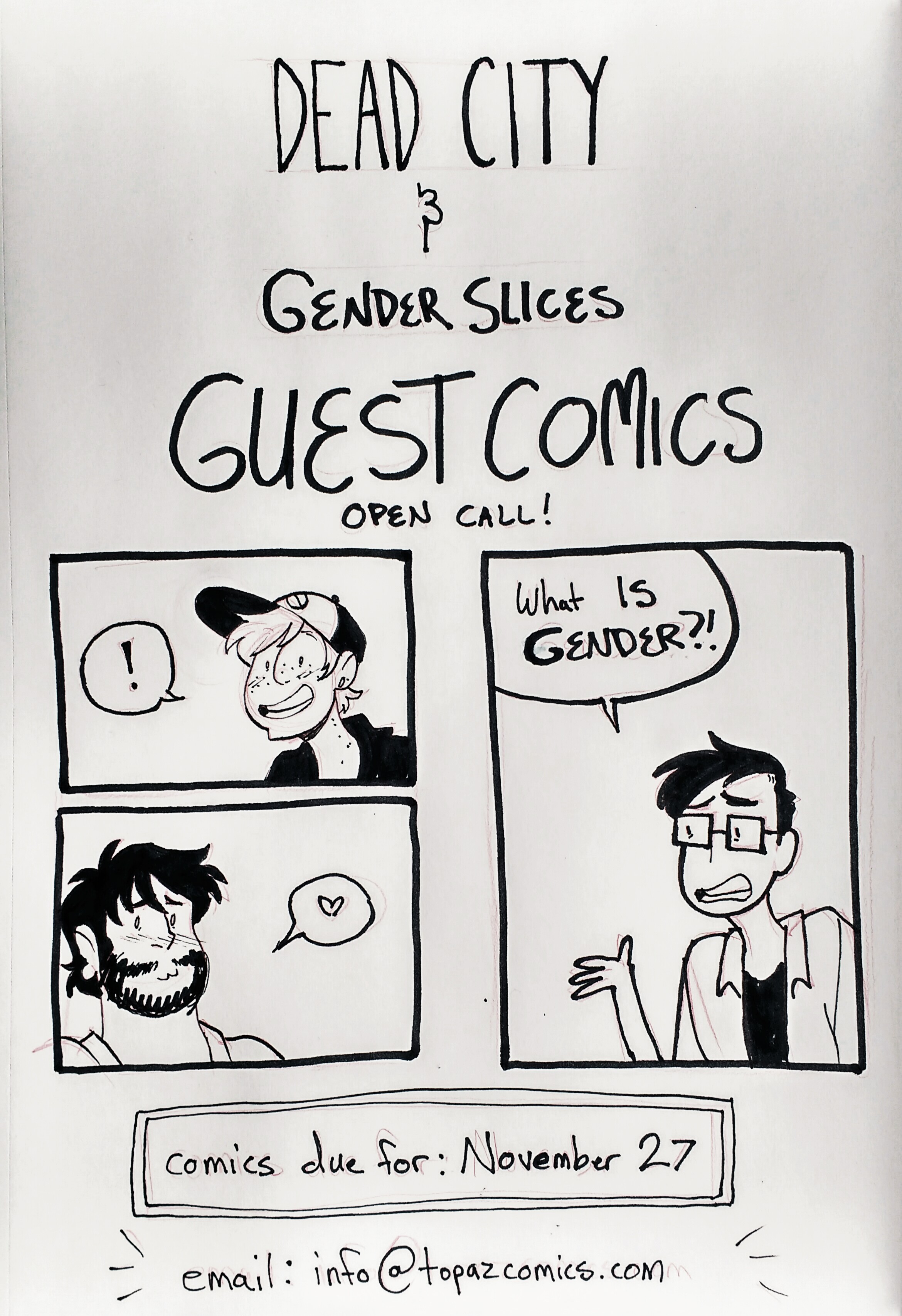 We’re looking for four artists for Dead City comics, and four artists for Gender Slices comics (illustrations are fine too) to post throughout the month of May. Comics will be posted every Tuesday here (topazcomics.com), Tapas, and Smackjeeves.