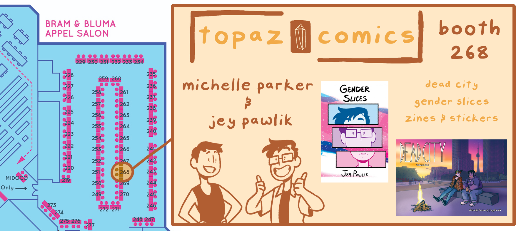 Topaz Comics (Michelle Parker & Jey Pawlik) will be at TCAF @ booth 2083 on April 29-30th! We’ll be debuting the complete Dead City omnibus book + zines, stickers and prints! Also go check out ByeLacey for her books and merch as well.