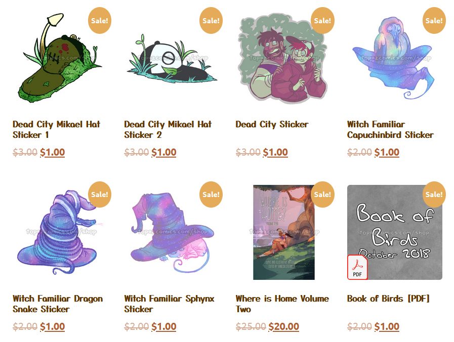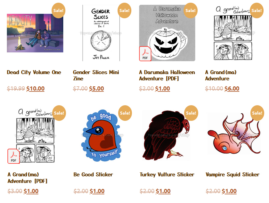 Hey everyone! We’re having a big sale of older stickers, PDFs, prints and books over at the Topaz Comics Shop
