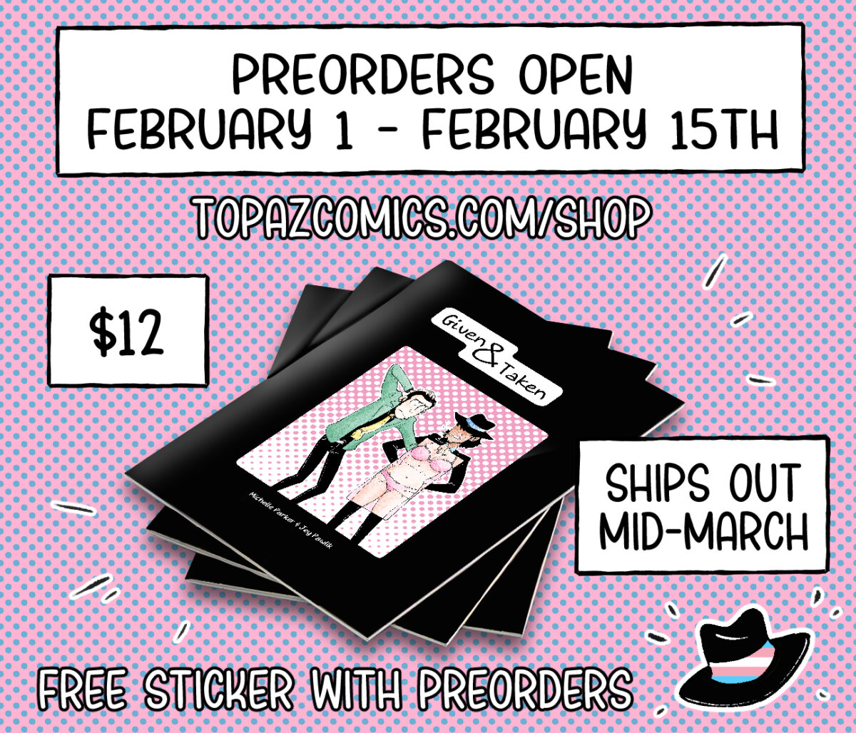 Preorders will close on February 15th and books will be shipped out March 15th. Regular orders will resume after March 15th. I’ll also have them available in person at TCAF (April 29th-30th)