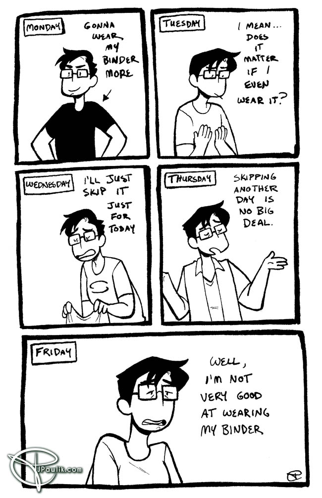 Monday: I’m gonna wear my binder and feel less dysphoric! Tuesday: It doesn’t make a difference – I’m misgendered anyway… Wednesday: I’ll take a break Thursday: I’ll take another break… Friday: Guess I only wore it once this week again… I’m a lazy trans person Remember you can see Gender Slices comics 2 weeks early… Continue reading 119