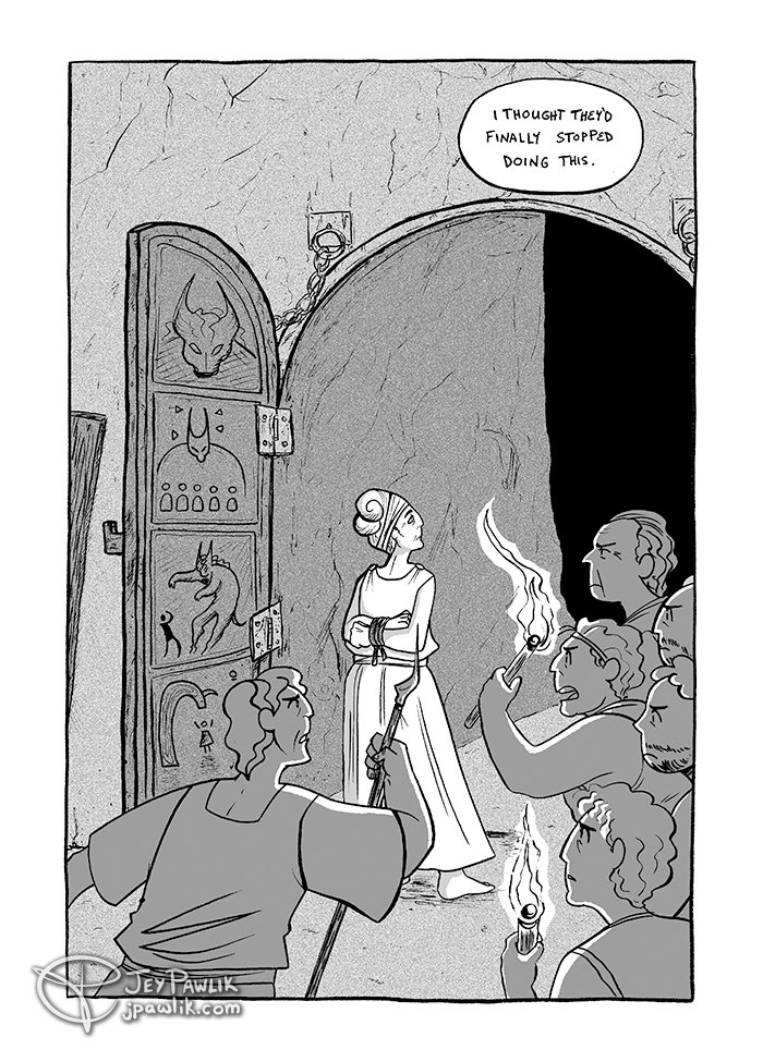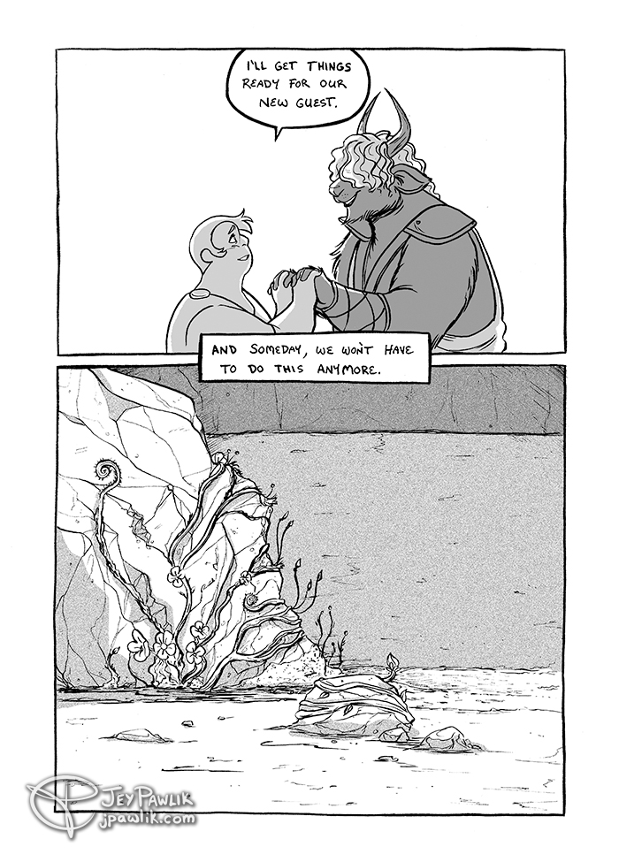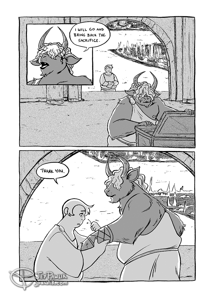 Page 5 of the short 6 page comic Michelle and I did for the Bear Company Vol. 2 anthology. The minotaur was a lot of fun to design and draw, but I also really like that a lot of people call the human Theseus. It’s not quite the original minotaur story so it can be… Continue reading House At The Center – 5
