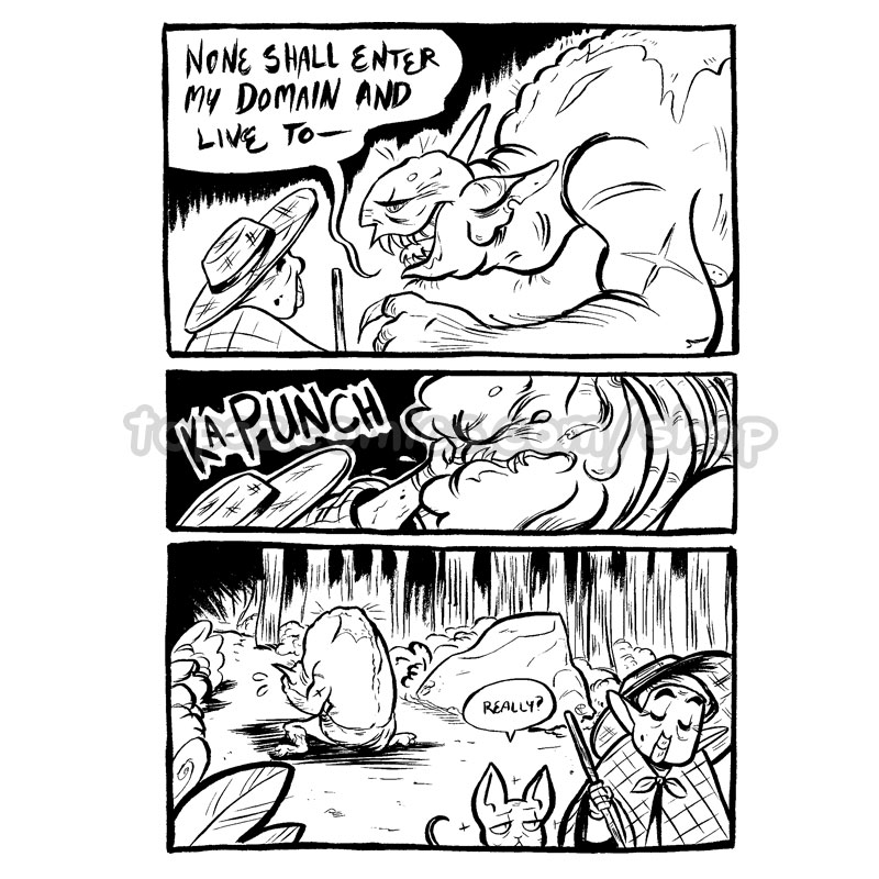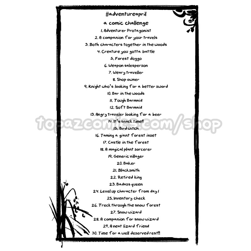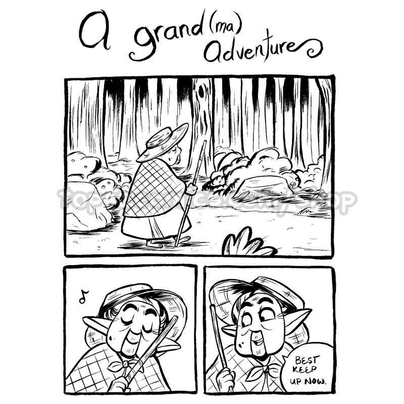 For an April comics challenge, Jey used a prompt list and draws one page of a comic every day for a month. The end result is an elderly lady goes on an adventure through a D&D inspired forest.