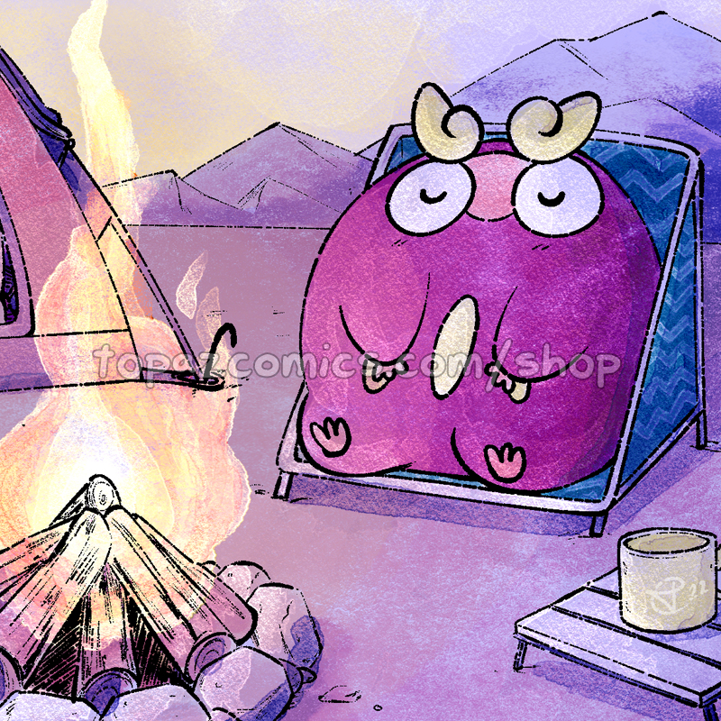 Darumaka relaxing on a solo camping trip with a vast sky above her. Inspired by the anime & manga Laid Back Camp