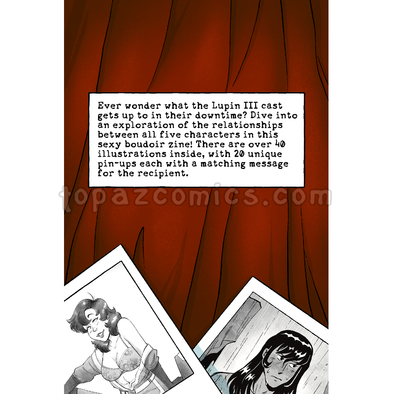 Ever wonder what the Lupin III cast gets up to in their downtime? Dive into an exploration of the relationships between all five characters in this pinup boudoir zine! There are over 40 illustrations inside, with 20 unique pin-ups each with a matching message for the recipient.